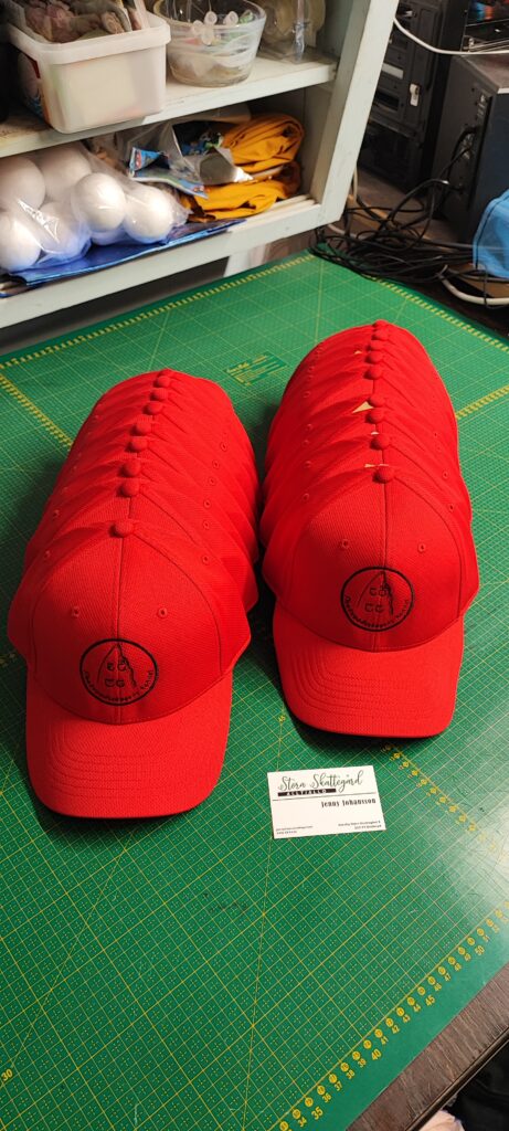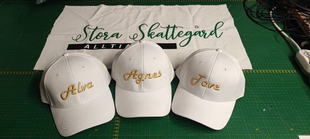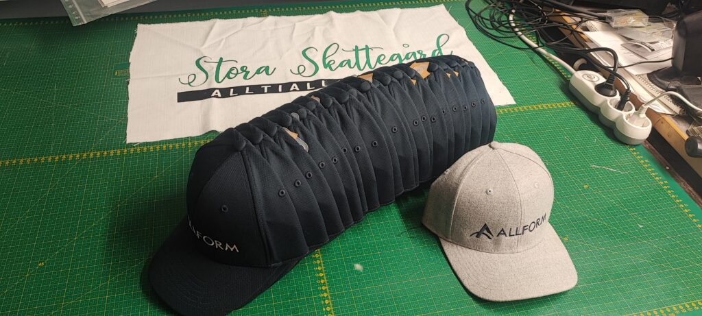 Vi har en 6 nålars brodyrmaskin, gör sublimeringstryck och vinyltryck.